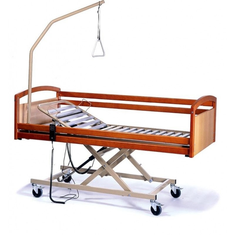 Łóżko rehabilitacyjne / ortopedyczne z elektryczną regulacją wysokości leża oraz kąta oparcia. Wyposażenie standardowe obejmuje uchwyt do podnoszenia się, barierki bezpieczeństwa.